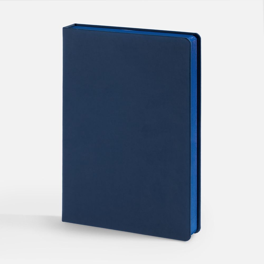 Ежедневник с твердой обложкой и тонированным обрезом, выполнен из материала Soft Touch, синий НН, дополнен ляссе в цвет обложки.