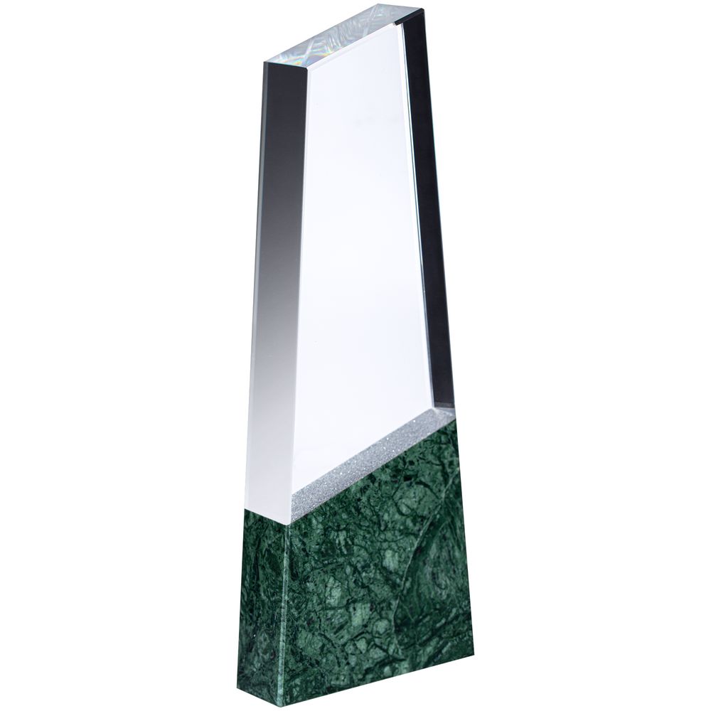 На основании из серпентина закреплен блок из стекла К9, в основе которого лежит оптическое боросиликатное стекло. Эту марку стекла отличает низкий процент посторонних включений, высокий показатель преломления и высокая прозрачность — идеальные качества для изготовления наград премиального уровня.