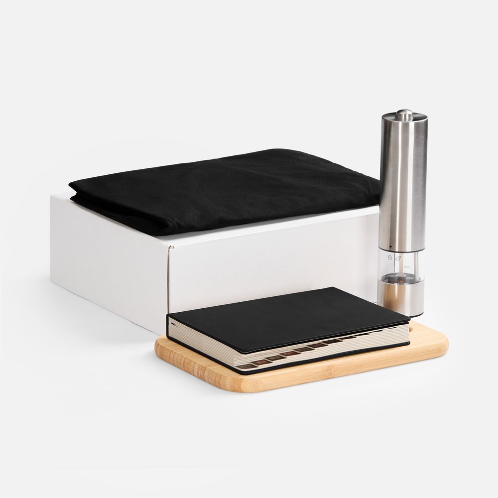 Материал: мельница - нержавеющая сталь; пластик; фартук - хлопок 100%, плотность 240 г/м²; ежедневник - покрытие софт-тач; доска - бамбук; коробка - микрогофрокартон, Т-23Е