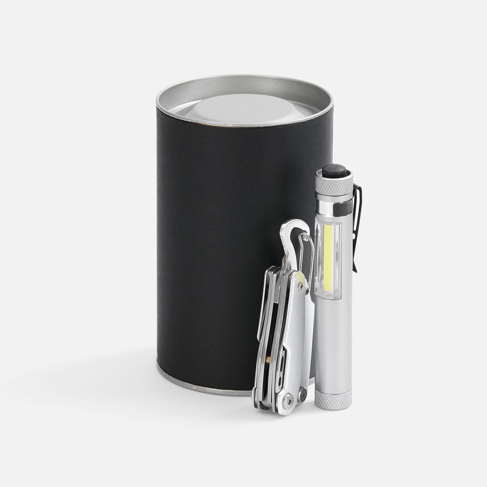 Материал: мультитул - нержавеющая сталь; фонарик - алюминий; тубус - переплетный картон, бумага Zhengba Black; жесть