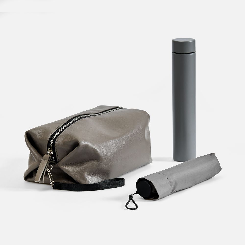 Материал: несессер - искусственная кожа; зонт - полиэстер, 300Т, спицы - стеклопластик; ручка - прорезиненный пластик; бутылка - нержавеющая сталь, 304 внутри, 201 снаружи; матовое покрытие