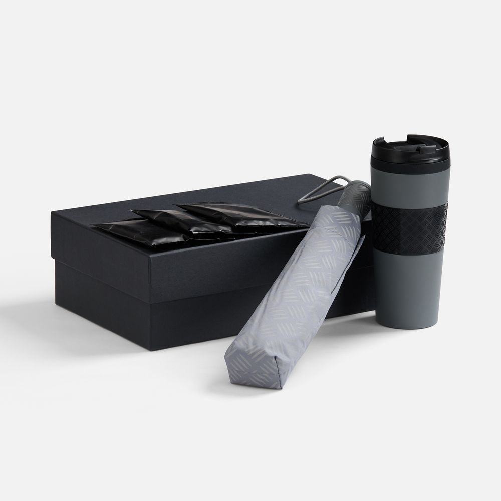 Материал: термостакан - нержавеющая сталь, 304 внутри, 201 снаружи; крышка - пластик; манжета - силикон; зонт - эпонж, 190D; рама - сталь; ручка, топ - пластик; спицы - стеклопластик; упаковка - картон, бумага