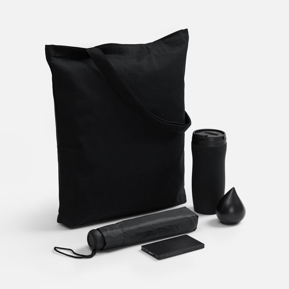 Материал: зонт - полиэстер 190T, ручка - пластик; покрытие софт-тач; каркас, спицы - металл; аккумулятор - пластик; крышка термостакана, внутренняя колба - пластик, корпус - нержавеющая сталь; покрытие софт-тач; сумка - хлопок 100%, плотность 210 г/м²; антистресс - вспененный полиуретан