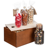Материал: чай - стекло, пробка; ящик, наполнитель - дерево; арахис, вишня, миндаль - полиэтилен