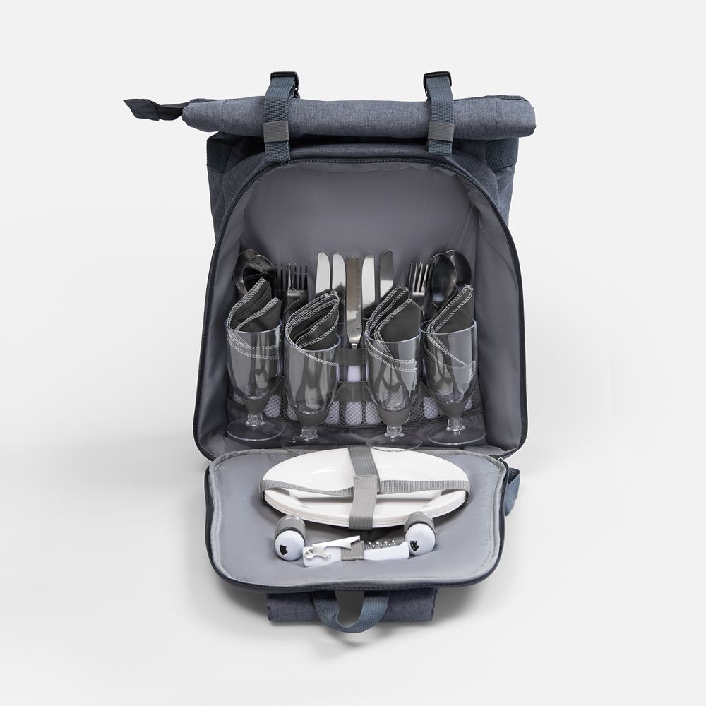 Материал: рюкзак - переработанный полиэстер, 300D с полиуретановой пропиткой, PEVA; тарелки и бокалы - полистирол; приборы - нержавеющая сталь, пластик
