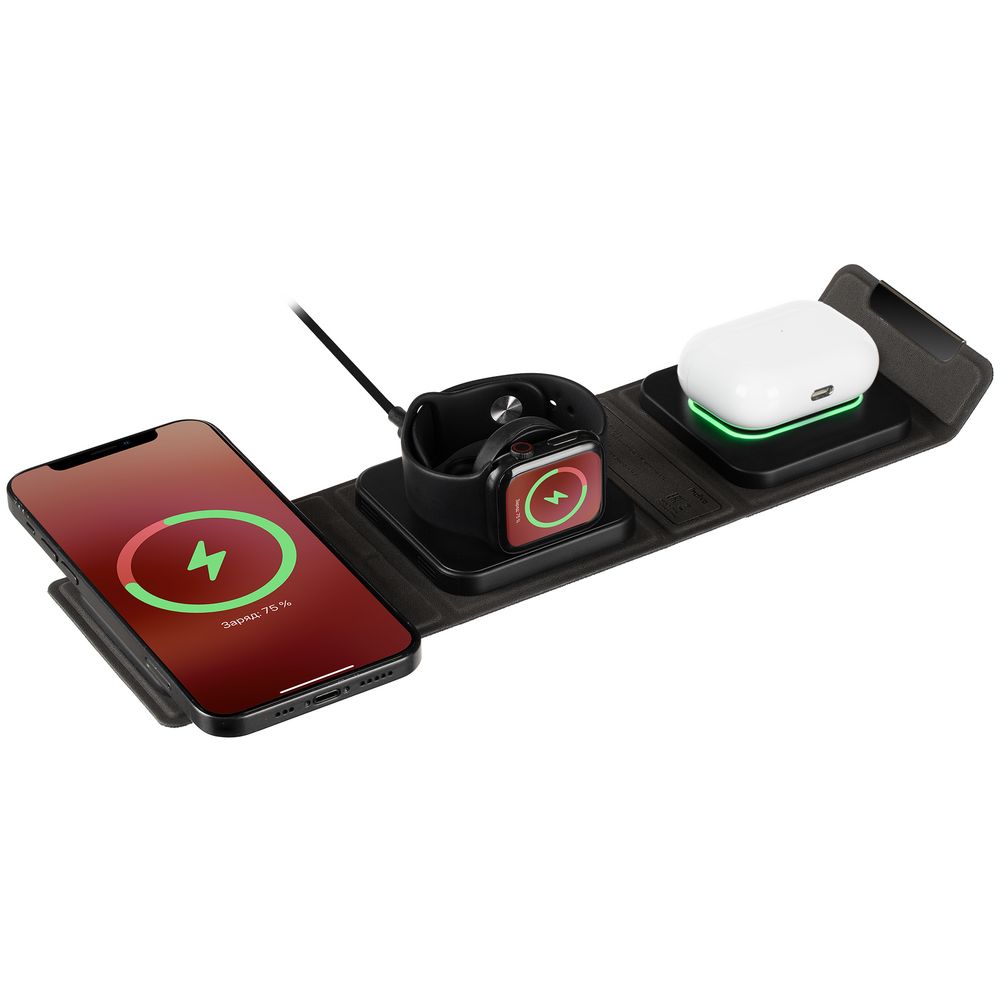Зарядная станция совместима со всеми смартфонами, поддерживающими технологию беспроводной зарядки Qi. Также предусмотрено место для зарядки часов Apple Watch и наушников. Зарядка начнется автоматически при размещении устройств на индукционной площадке.